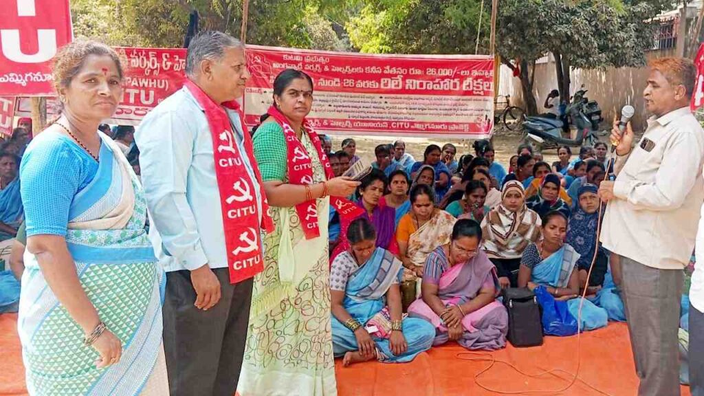 సీమాంధ్ర సారధి, ఎమ్మిగనూరు, ఫిబ్రవరి 24: కేంద్ర, రాష్ట్ర ప్రభుత్వాలు అంగన్వాడీలకు జీతాల పెంపు విషయంలో నిర్లక్ష్యం వహిస్తున్నాయని సీఐటీయూ జిల్లా అధ్యక్షుడు పీఎస్ రాధాకృష్ణ ఆరోపించారు. మంగళవారం అంగన్వాడీలు చేపట్టిన రిలే దీక్షలకు ఆయన మద్దతు తెలిపారు. కేంద్రంలో మోదీ, రాష్ట్రంలో చంద్రబాబు నిధుల సమీకరణ పేరుతో అంగన్వాడీలను మభ్యపెడుతున్నారని, కనీస వేతనం ఇవ్వడంలో వైఫల్యం చెందారని విమర్శించారు. గతంలో అంగన్వాడీల 42 రోజులు సమ్మె సందర్భంగా ప్రభుత్వం ఇచ్చిన హామీని నిలబెట్టుకోవాలని డిమాండ్ చేశారు. కనీస వేతనం రూ. 26 వేలు ప్రకటించకపోతే మార్చి 2న చలో విజయవాడ కార్యక్రమం చేపడతామని ప్రభుత్వాన్ని హెచ్చరించారు. రాష్ట్రవ్యాప్తంగా ఈనెల 23 నుంచి 26 వరకు రిలే నిరాహార దీక్షలు జరుగుతాయని చెప్పారు. కార్యక్రమంలో యూనియన్ అధ్యక్ష కార్యదర్శులు గోవిందు, రాముడు, సురేష్, రవి, శ్రీను, అంగన్వాడీ వర్కర్స్ అండ్ హెల్పర్స్ యూనియన్ నాయకురాళ్లు భాగ్యమ్మ నాగలక్ష్మి, నాగ శిరోమణి, సునీతమ్మ, హుస్సేనమ్మ, రామేశ్వరమ్మ, రేణుక, రాధా, హేమలత, సుశీల, రోజామణి పాల్గొన్నారు.